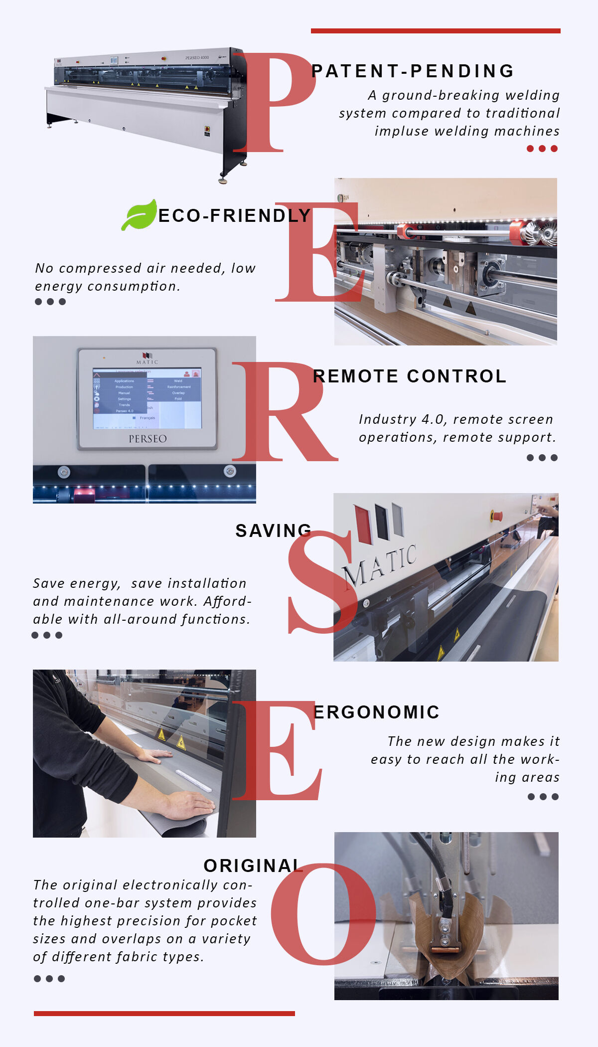 Este un sistem de lipit complet original și inovator comparativ cu mașinile tradiționale de lipire prin impuls electric. Matic PERSEO este un sistem de lipit complet original și inovator în comparație cu mașinile de lipit cu impulsuri electrice tradiționale. Este ecologic, nu este nevoie de un compresor de aer, ceea ce înseamnă o economie semnificativă de energie electrică.